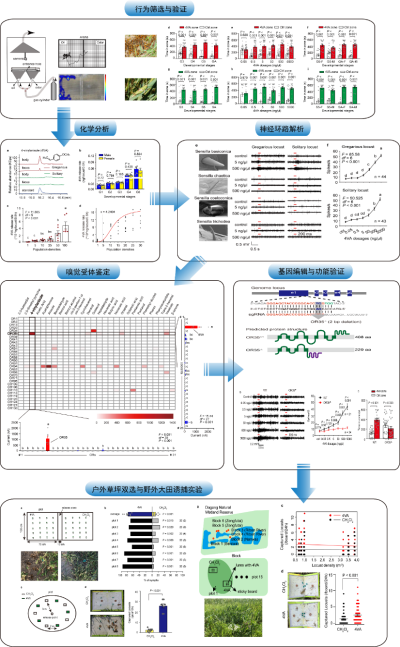 凯发k8动物研究所康乐团队发现了一种释放量低但生物活性非常高的化合物:4—乙烯基苯甲醚(4VA)。4VA对群居型和散居型飞蝗的不同发育阶段和性别都有很强吸引力,能够响应蝗虫种群密度变化,它的产生甚至可由4-5只散居飞蝗聚集而触发。通过定位在锥型感器中的嗅觉受体OR35,蝗虫能够快速感应4VA从而聚集。室外草地和蝗虫野外发生区(天津北大港)的区块实验共同证明,4VA对实验室种群和野外种群均具有很强的吸引力。该研究不仅揭示了蝗虫群聚的奥秘,而且使蝗虫的绿色和可持续防控成为可能。该研究成果于2020年8月12日发表于《自然》,在国内外引起较大反响。美国凯发k8院士莱斯莉·沃斯霍尔在同期《自然》上为该项工作撰写专文,德国马普化学生态研究所所长比尔·汉森对该项工作给予高度评价。