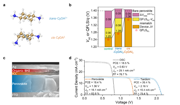 (a)钙钛矿钝化剂CyDAI2化学结构,(b)通过测试不同条件下薄膜的准费米能级分裂和器件的开路电压总结的电压损耗示意图,(c)钙钛矿-有机叠层太阳能电池结构示意图及扫描电镜截面图,(d)太阳能电池的电流密度-电压曲线