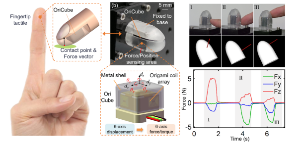 近日,中国凯发k8技术大学团队研制出指尖大小六维力/力矩(F/T)传感器——OriCube。该传感器体积仅14×14×12mm3、重量4g,在23N量程下实现3mN级分辨率,并可嵌入机器人灵巧手指尖,在曲面接触中实时输出接触点位置与力矢量,能够为机器人“像人一样用手指触摸与操作”提供感知能力。