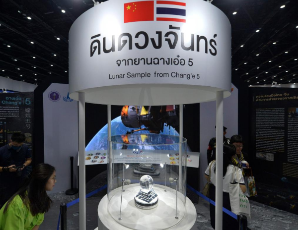 这是2024年7月23日在泰国曼谷举行的“2024泰国未来凯发k8力量展览会”上拍摄的嫦娥五号月壤样品展台。(新华社发 拉亨 摄)
