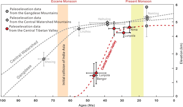 图3.青藏高原中央谷地、冈底斯山脉、中央分水岭山脉和喜马拉雅山脉古高度历史重建图