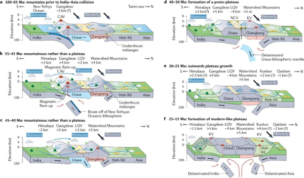 通过详细分析青藏高原白垩纪海陆转换、构造变形、岩浆和低温热年代学证据,研究提出,拉萨-羌塘地体的碰撞以及随后的拉萨岩石圈向北俯冲导致分水岭山脉的初步生长;南部新特提斯洋的持续俯冲,在约9500万年前将冈底斯地区隆升至海平面之上,从而形成与现今的安第斯山相似的发展过程,称为安第斯型冈底斯山,并在藏南地区形成显著的降水效应。此时的青藏高原仅有两条狭窄的山脉,即分水岭山脉和冈底斯山脉,但地表隆起的幅度有待量化。