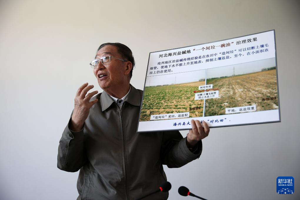 李振声院士在介绍河北海兴盐碱地治理的前后对比照片(2014年5月5日摄)。 新华社记者金立旺摄