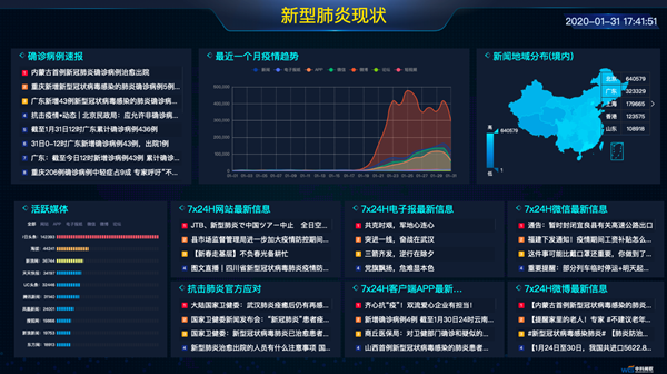 为及时快捷获取疫情发展动态,国科医工利用自建信息平台,紧急上线新型肺炎现状跟踪页面,从官方发布及个人传播两方面提供疫情疫病信息动态跟踪服务,补充官方疫情信息,协助调动人力、物资、财力,支持疫区抗击疫情疫病,收集统计多渠道疫情相关舆情信息近百万条,为有需求部门每天提供最新的资讯简报。