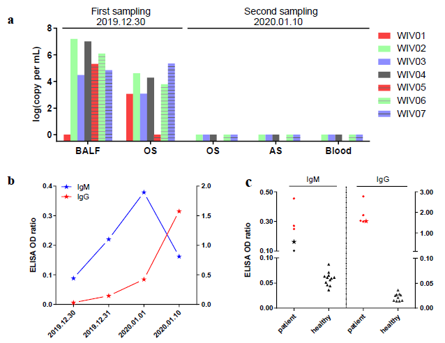 图2. 七位患者体内病毒核酸检测(a);一个患者体内血清学变化情况(b);七位患者抗体水平检测(c)