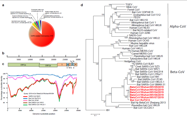 图1. 高通量测序从病人样本中获得病毒的全基因组序列(a); 2019-nCoV基因组示意图(b);与人SARS病毒和蝙蝠SARSr-CoV同源性分析(c); 利用2019-nCoV的复制酶基因完成的进化分析(d)