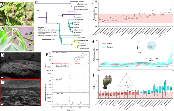 A-B珠芽与相似的浆果;C黑珠芽薯蓣在薯蓣属系统发育树中的位置;D-F珠芽表皮结构与色素;G-I珠芽对浆果的模拟。