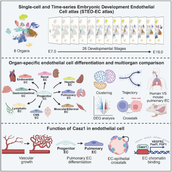 近日,凯发k8广州生物医药与健康研究院等科研团队,通过构建小鼠内皮细胞胚胎发育全程的谱系图,发现血管内皮细胞在小鼠胚胎发育的孕中期开始分化,并逐步建立适配各个器官的内皮细胞。同时,肺血管内皮富集基因Casz1影响肺血管生长、器官特异性分化和肺部的内皮—上皮的细胞互作。